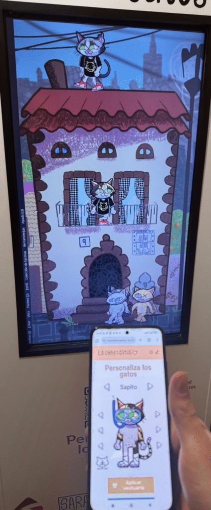 Digitalizamos los gatos en adopción de SVPAP como personajes jugables, integrados en un Tamagotchi gigante, accesible desde cualquier dispositivo de los transeúntes. El usuario participa activamente, toma decisiones y se involucra emocionalmente con los animales.